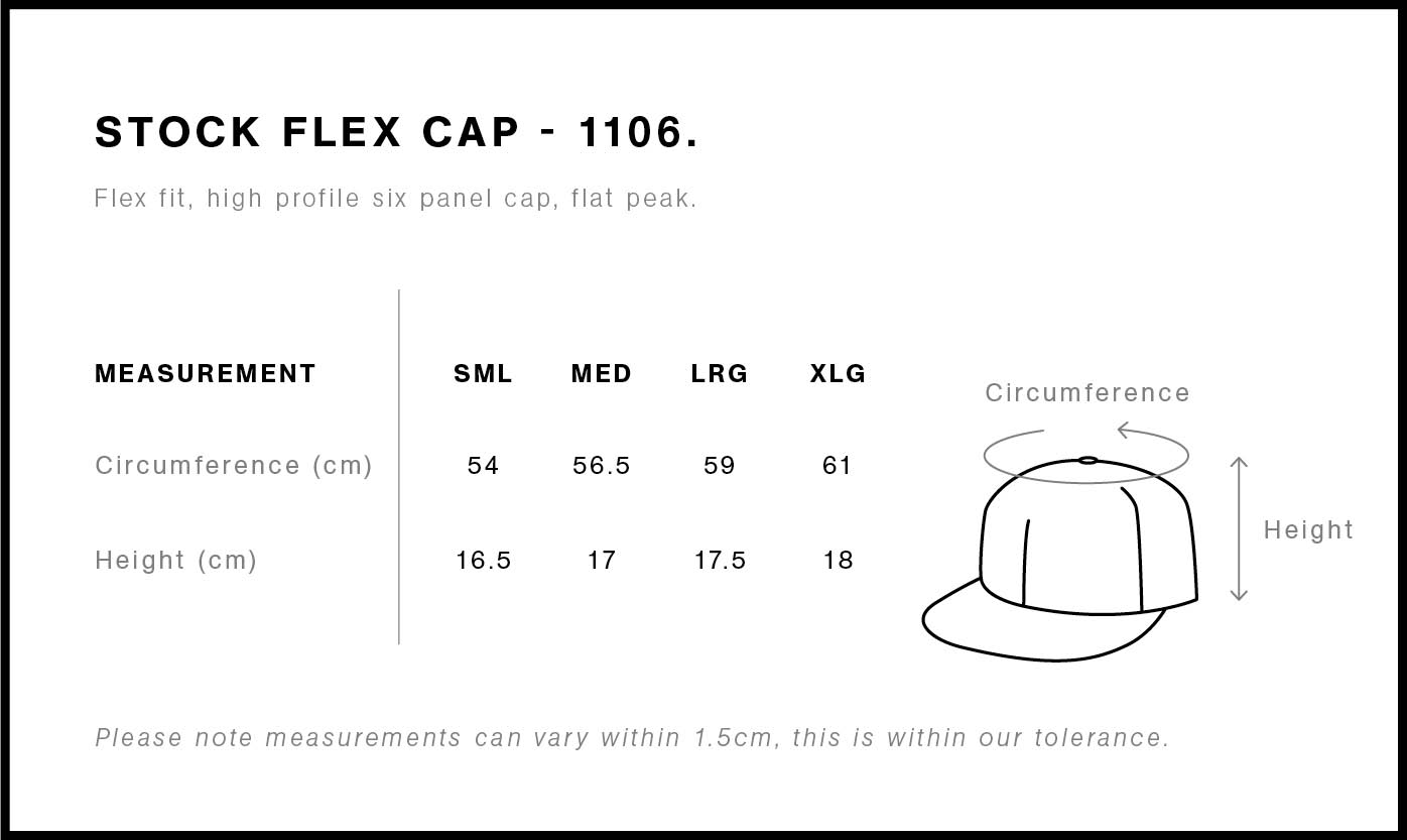 Fit: High Profile Fabric: Mid weight, 97% cotton 3% spandex Construction: High profile - six panel cap, flat peak Fitted cap with a contoured crown, twill stretch blend, elastic sweatband, stitching eyelets, tonal under-peak lining Tear-out AS Colour label
