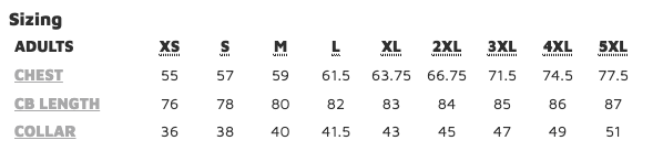 Chest | 55 | 57 | 59 | 61.5 | 63.75 | 66.75 | 71.5 | 74.5 | 77.5 |