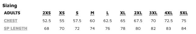 Chest | 52.5 | 55 | 57.5 | 60 | 62.5 | 65 | 67.5 | 70 | 72.5 | 75 |